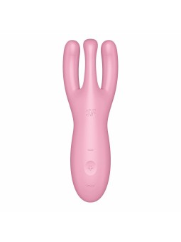 Satisfyer Threesome 4 to wibrator typu lay-on, który zapewnia szeroką i intensywną stymulację łechtaczki oraz warg sromowych. Trzy mocne silniki umieszczone w elastycznych ramionach równomiernie rozprowadzają wibracje: dwa boczne ramiona otulają wargi sromowe, a środkowe ramię skupia się na łechtaczce, oferując dodatkowe wrażenia przy jego opuszczeniu.